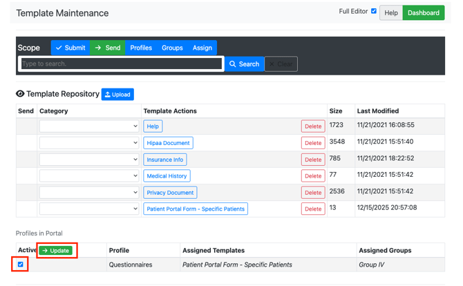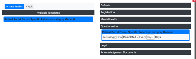 - If your form is not showing up in the profile section, confirm that the form is not showing up in the “Default Patient Templates” section. Forms that are available as default templates are not available to assign to specific profiles and groups as they are available to all patients. Delete the template from the “Default Patient Templates” if you only want the form available to a subset of patients.
