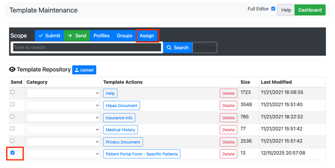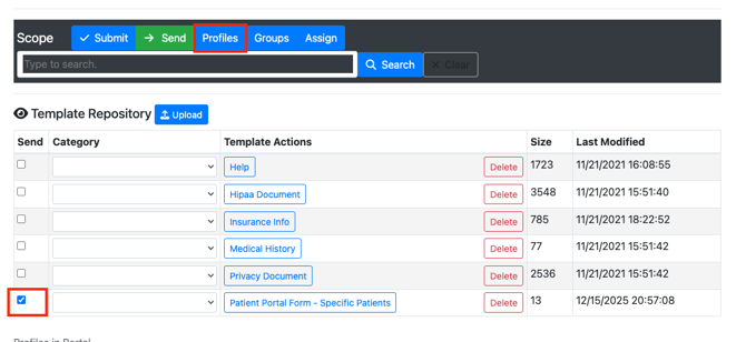 - Click the checkbox for the form in the Send column and then click “Profiles”. This adds the template to a Profile.