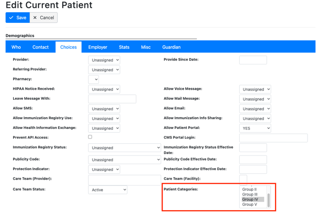 - Note: If you assign the the patient to a different group, the form should no longer be available. To view/modify a patient’s group, go to the patient chart > Demographics > Choices