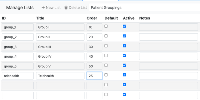 - Order value determines how the Patient Group list will be ordered. The smaller the number, the higher up in the list it will show up.